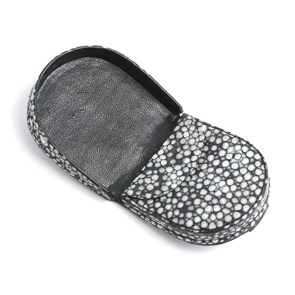 ※梅花皮は造語で、実際は「鰄」でカイラギです。京都国立博物館の重要文化財の刀にも使用されている革となっており、14世紀からとても高価なモノであったと記載されている書物が発見されたりしています。