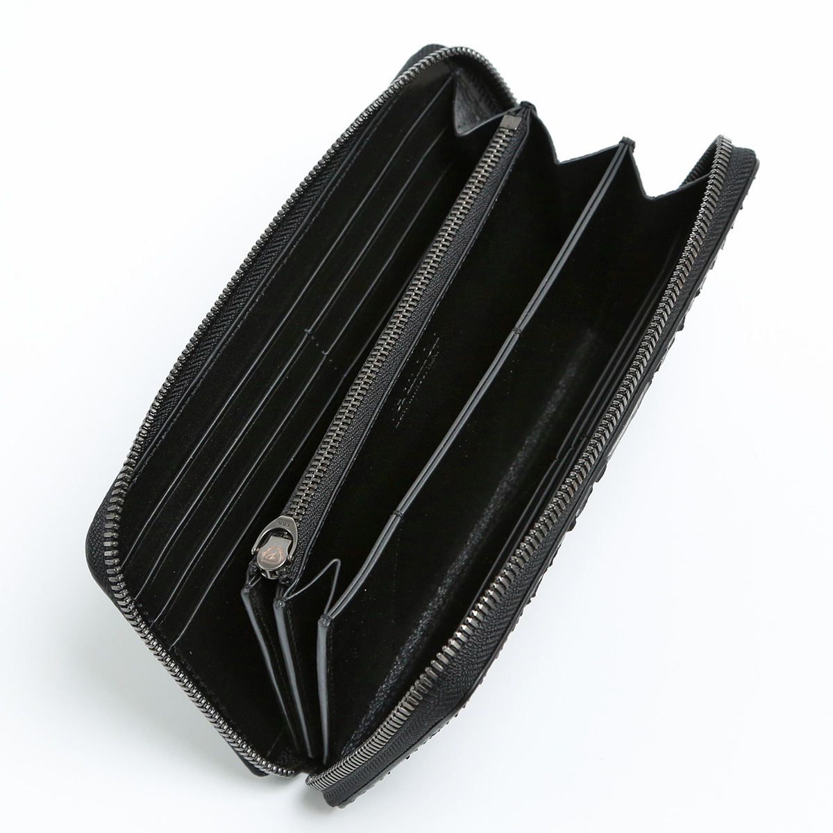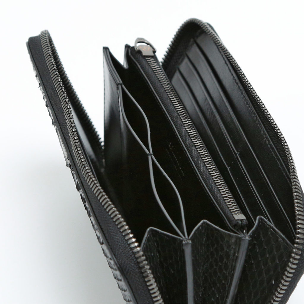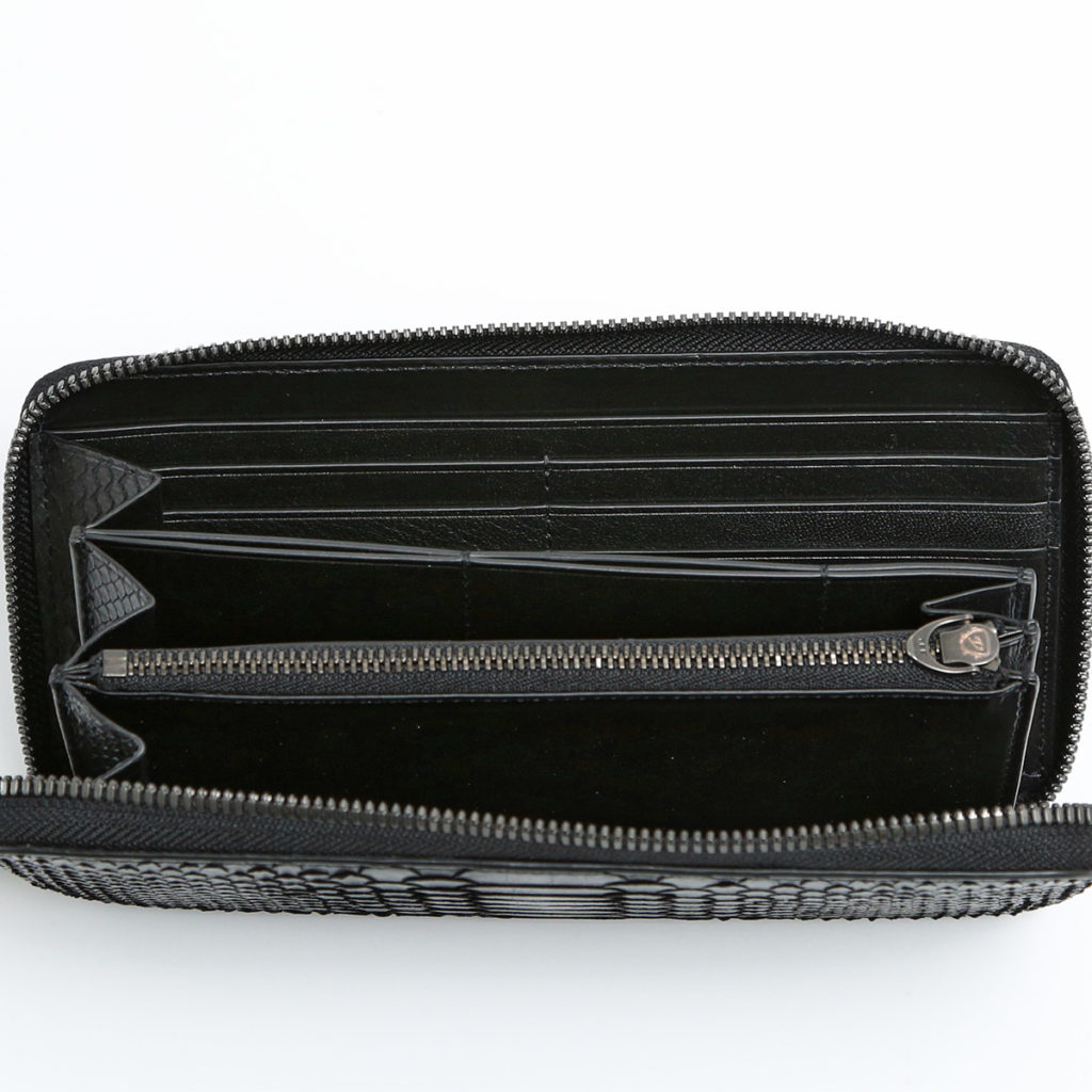 三方向にファスナーがラウンドしている長財布です。 蛇腹状になっているマチは片側にしかないため、口開きが良く紙幣やカード類などをスマートに出し入れできます。