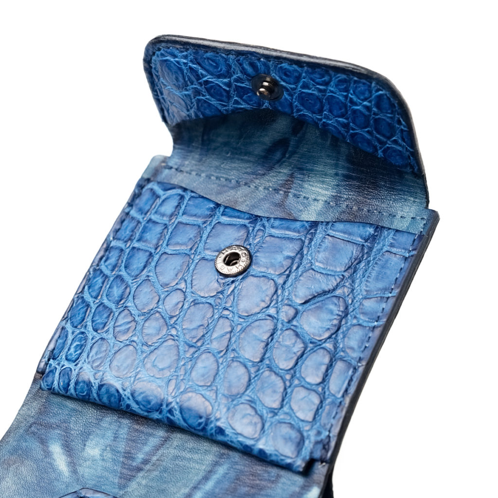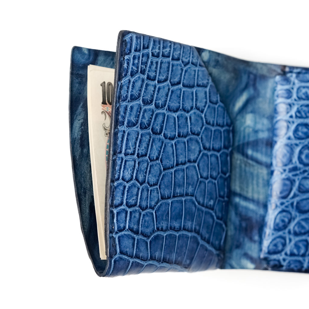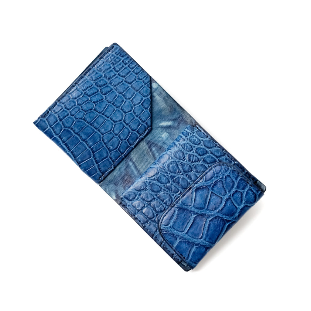 エキゾチックレザーの王様「スモールクロコダイル(学名ポロサス)」の革を、阿波徳島の伝統技術「正藍染め」で染色しています。