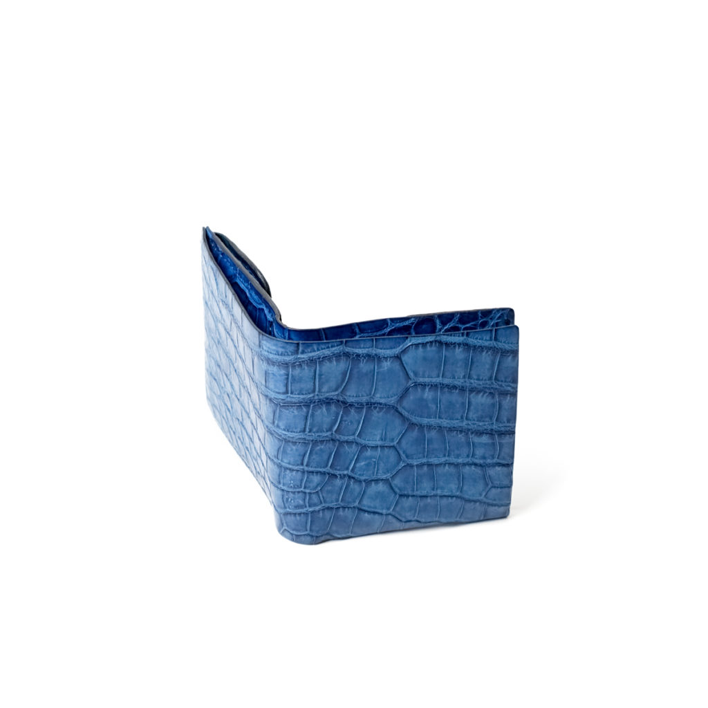 牛革でも難しいとされる超薄漉きを、エキゾチック革でも可能にしてしまう技術の高さと、究極にミニマルなデザインと鮮やかな空藍が目を引くアイテムです。