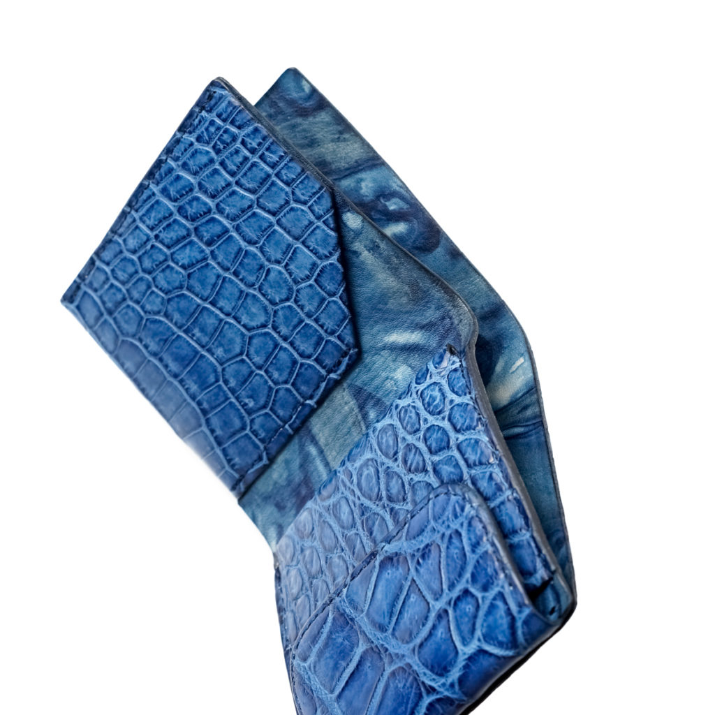 エキゾチックレザーの王様「スモールクロコダイル(学名ポロサス)」の革を、阿波徳島の伝統技術「正藍染め」で染色しています。