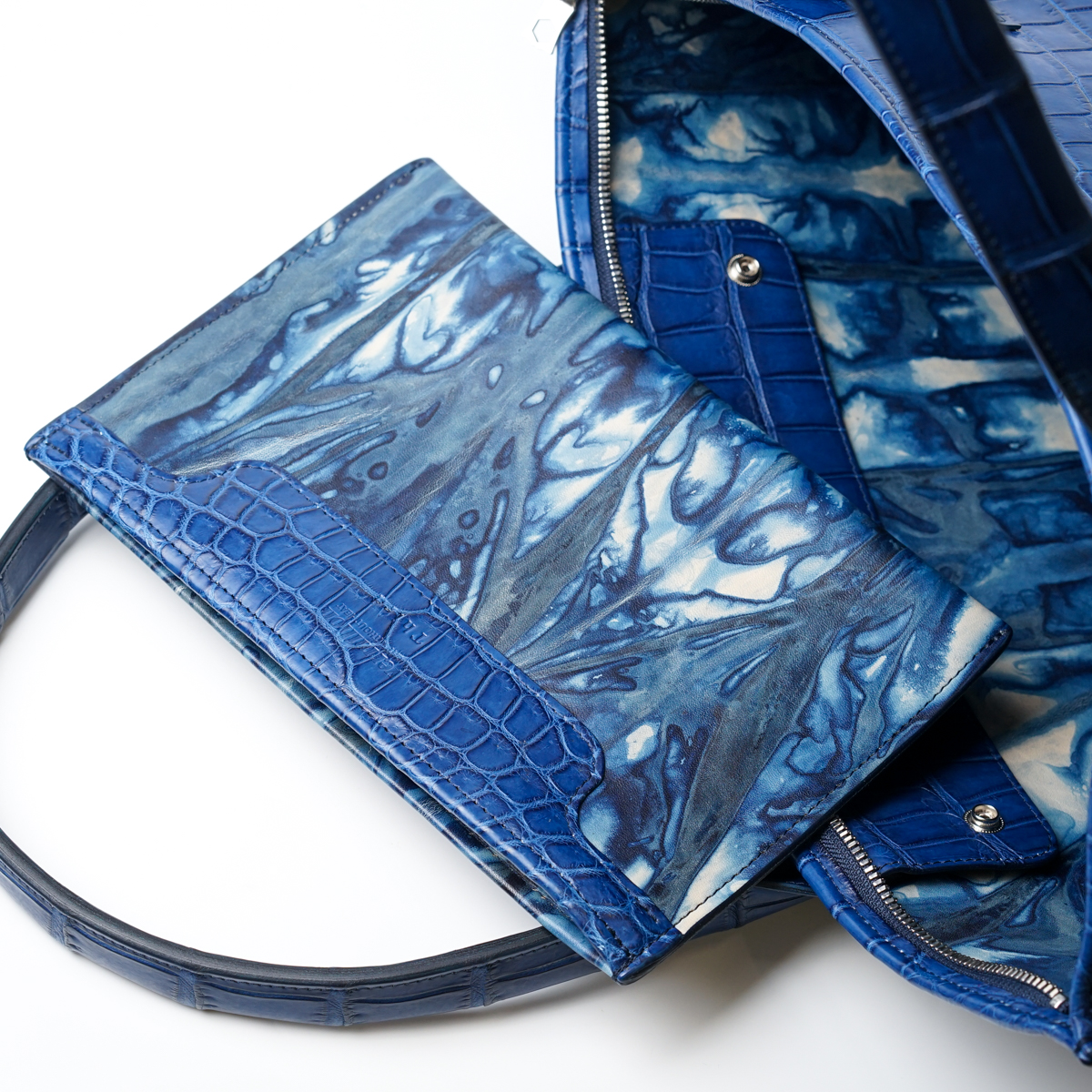 エキゾチックレザーの王様「スモールクロコダイル(学名ポロサス)」の革を、阿波徳島の伝統技術「正藍染め」で染色しています。